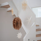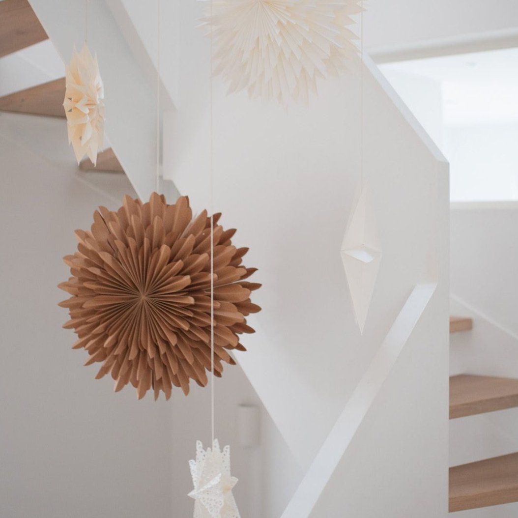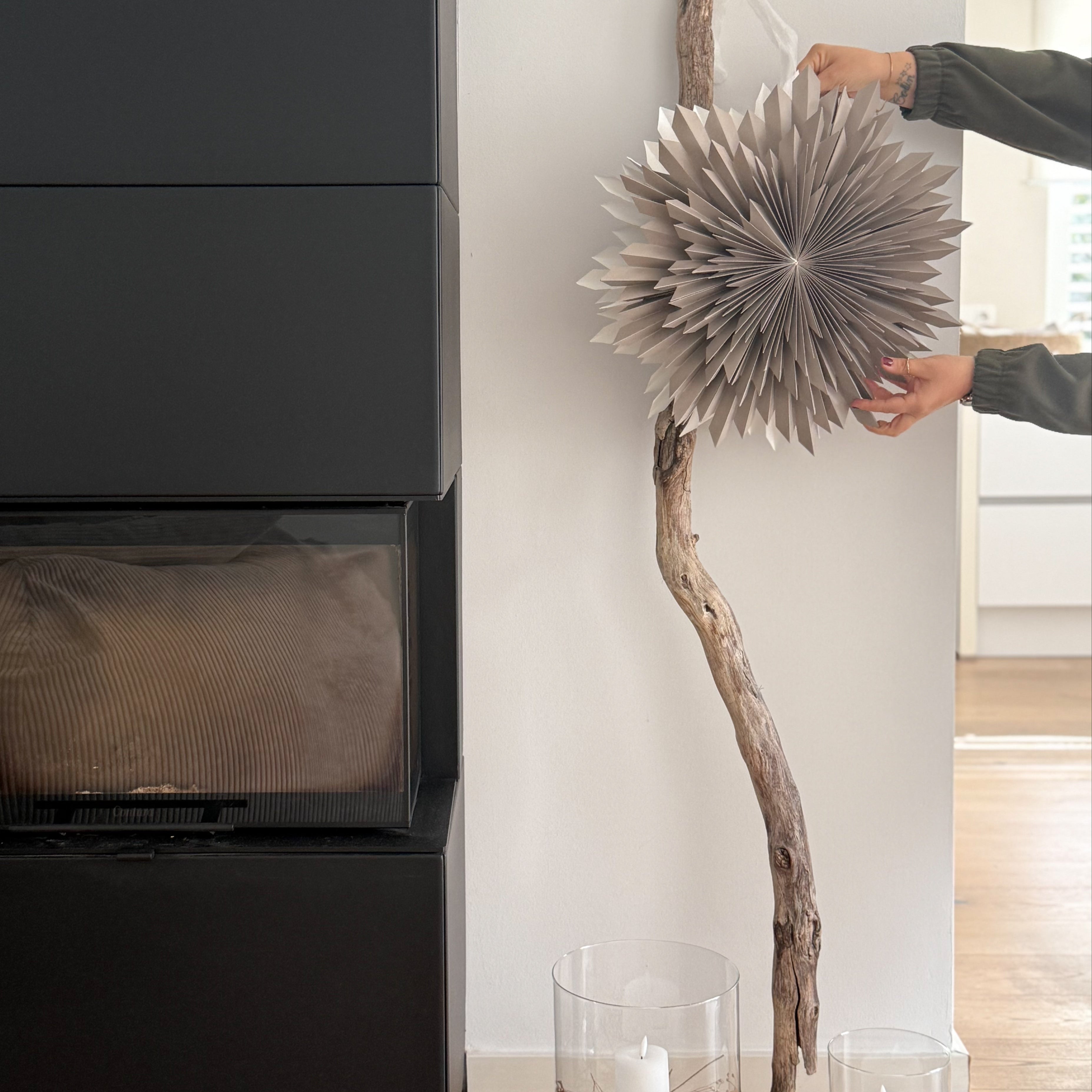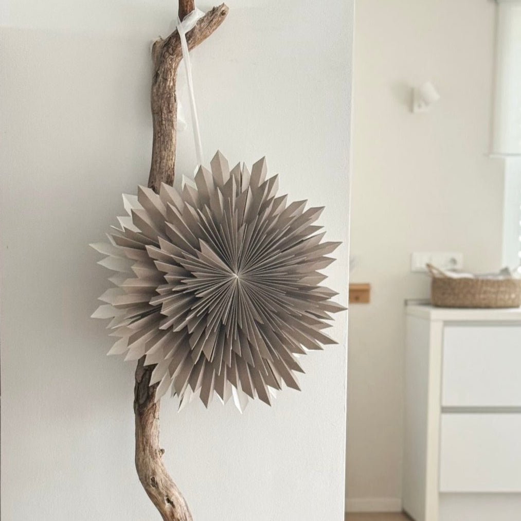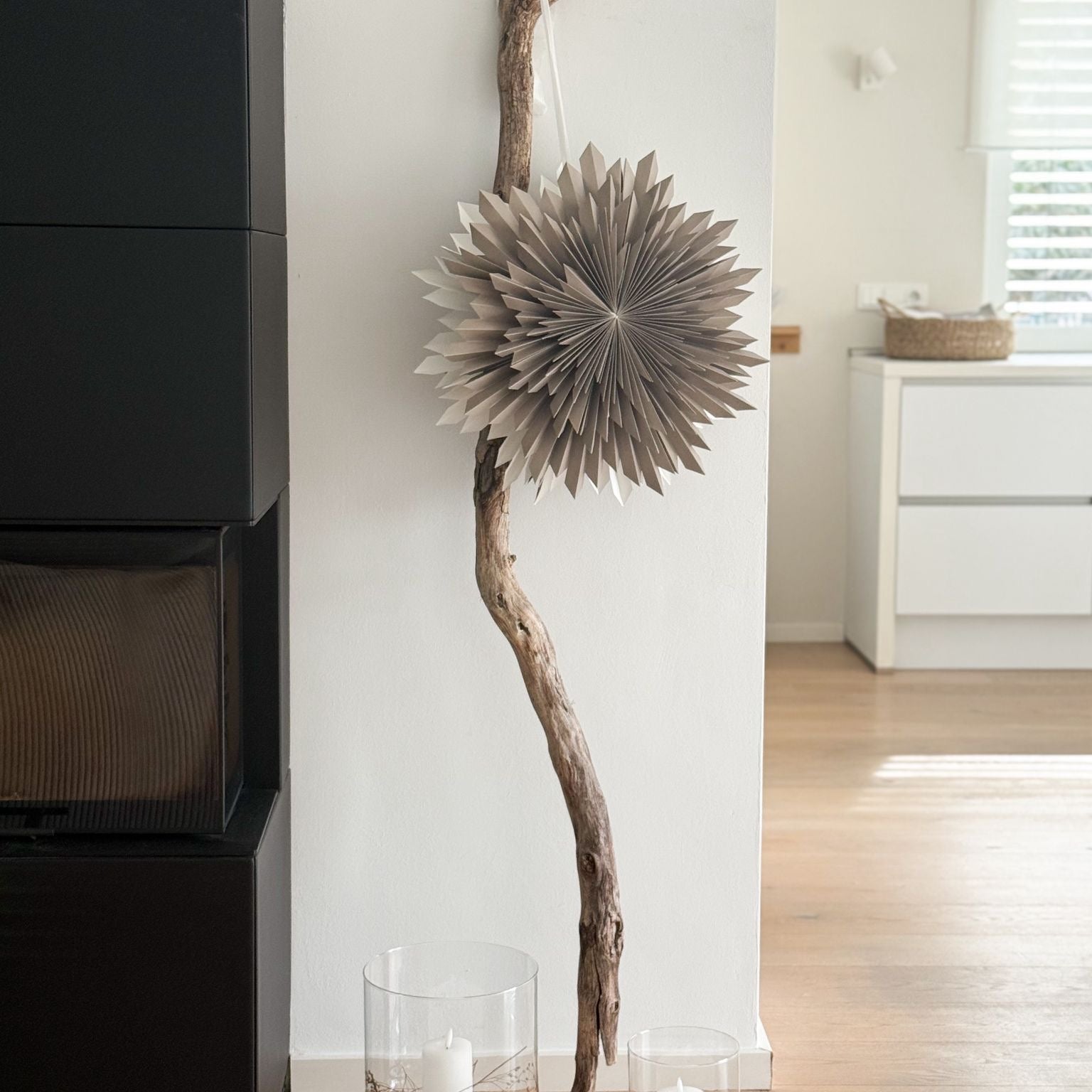Der Stern besteht aus hochwertigem, festem Papier in beige und entfaltet durch seine kunstvoll gefaltete Struktur eine eindrucksvolle Wirkung – egal ob am Fenster, an der Wand oder frei hängend im Raum. Mit seiner Größe eignet er sich besonders gut als zentrales Dekoelement und verleiht jedem Raum ein festliches Ambiente im modernen, skandinavisch inspirierten Stil.