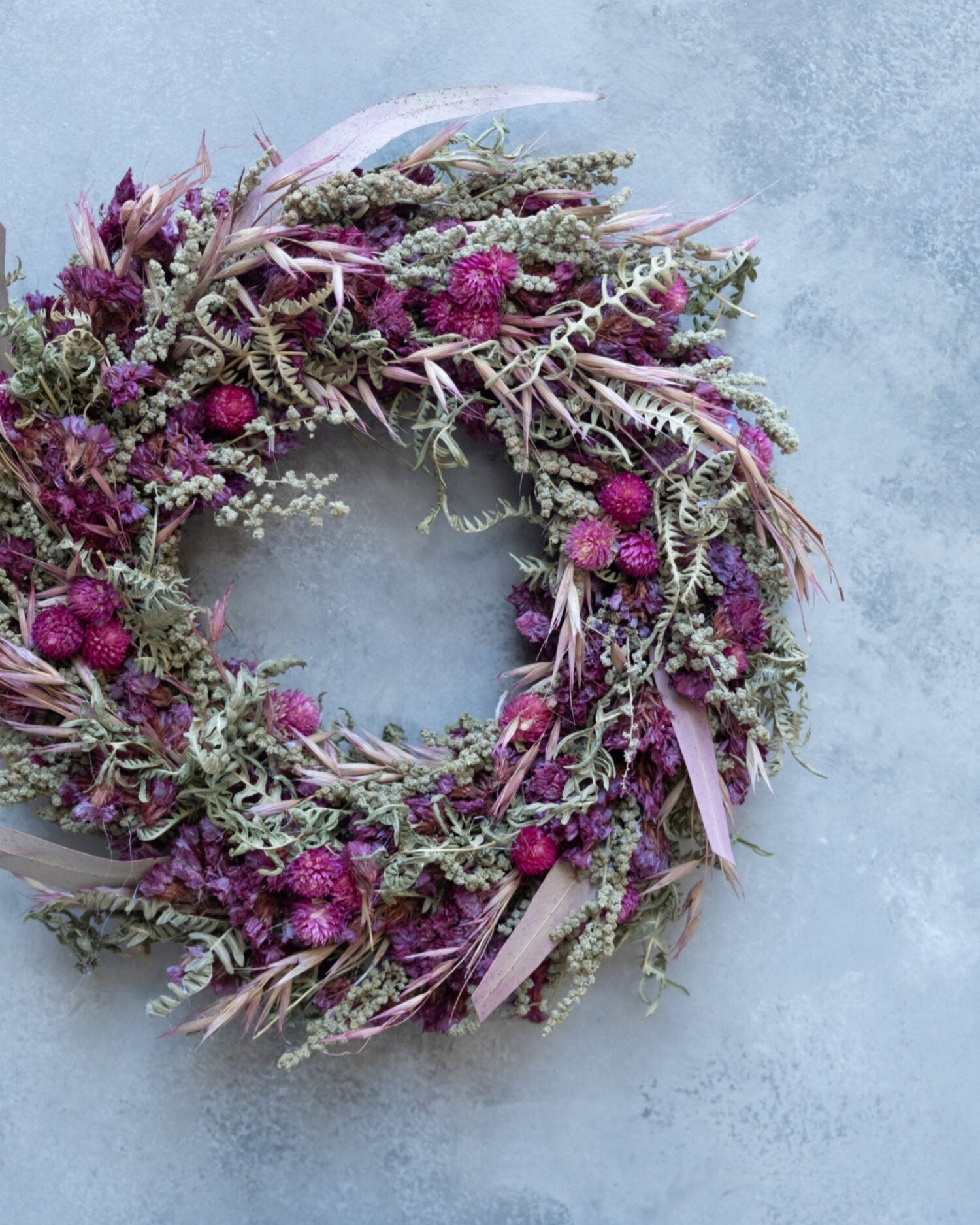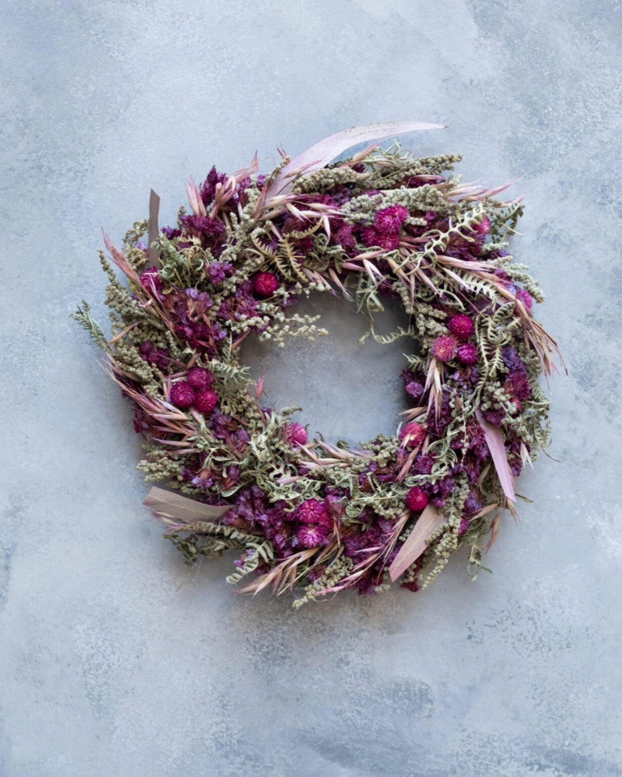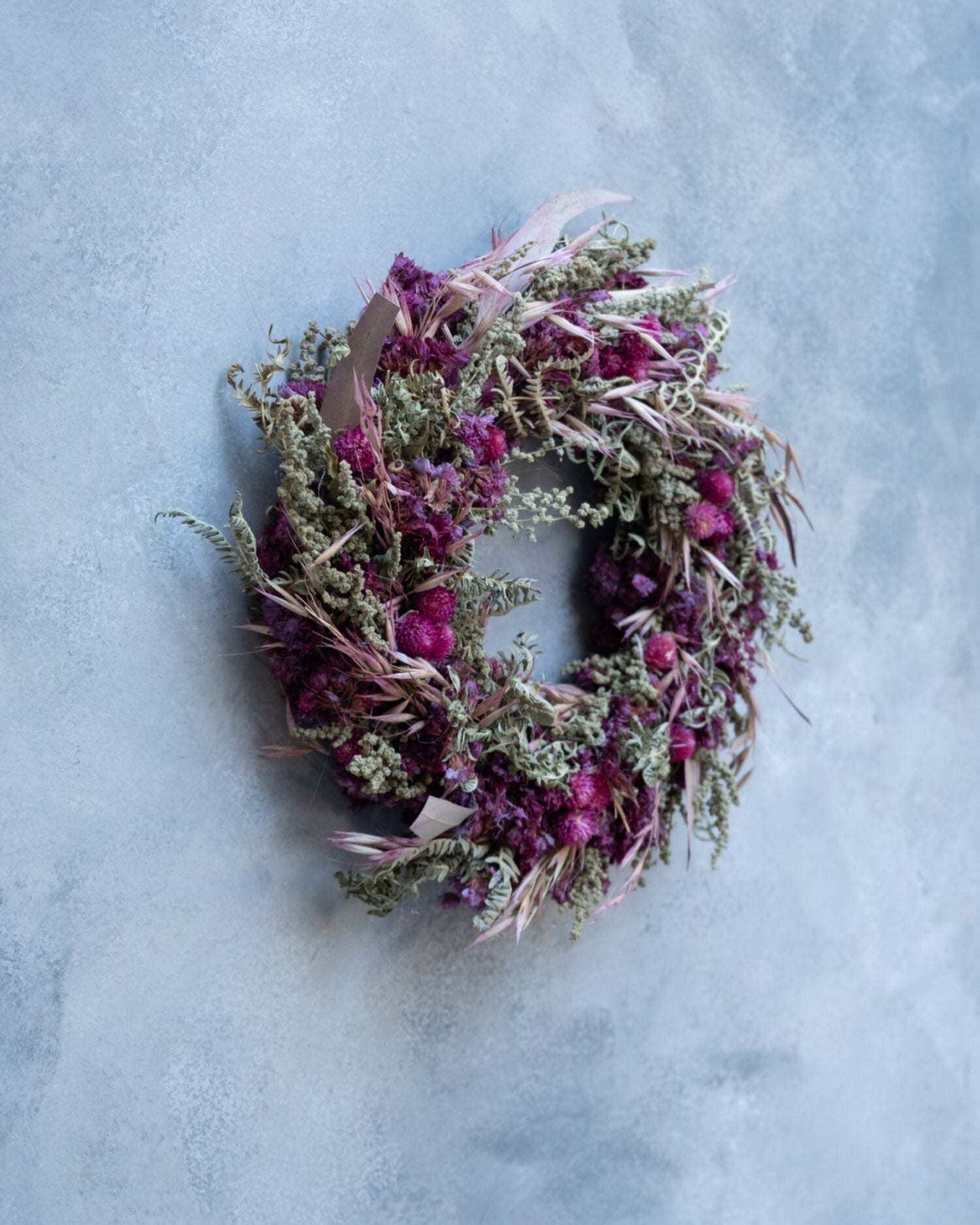 Dieser handgefertigte Kranz bringt natürliche Schönheit und zeitlose Eleganz in Ihr Zuhause. Gefertigt aus edlen Naturmaterialien wie Oregano, Farn, Kugelamarant, Eukalyptus, Hafer und Strandflieder vereint er dezente Töne mit warmen Nuancen.