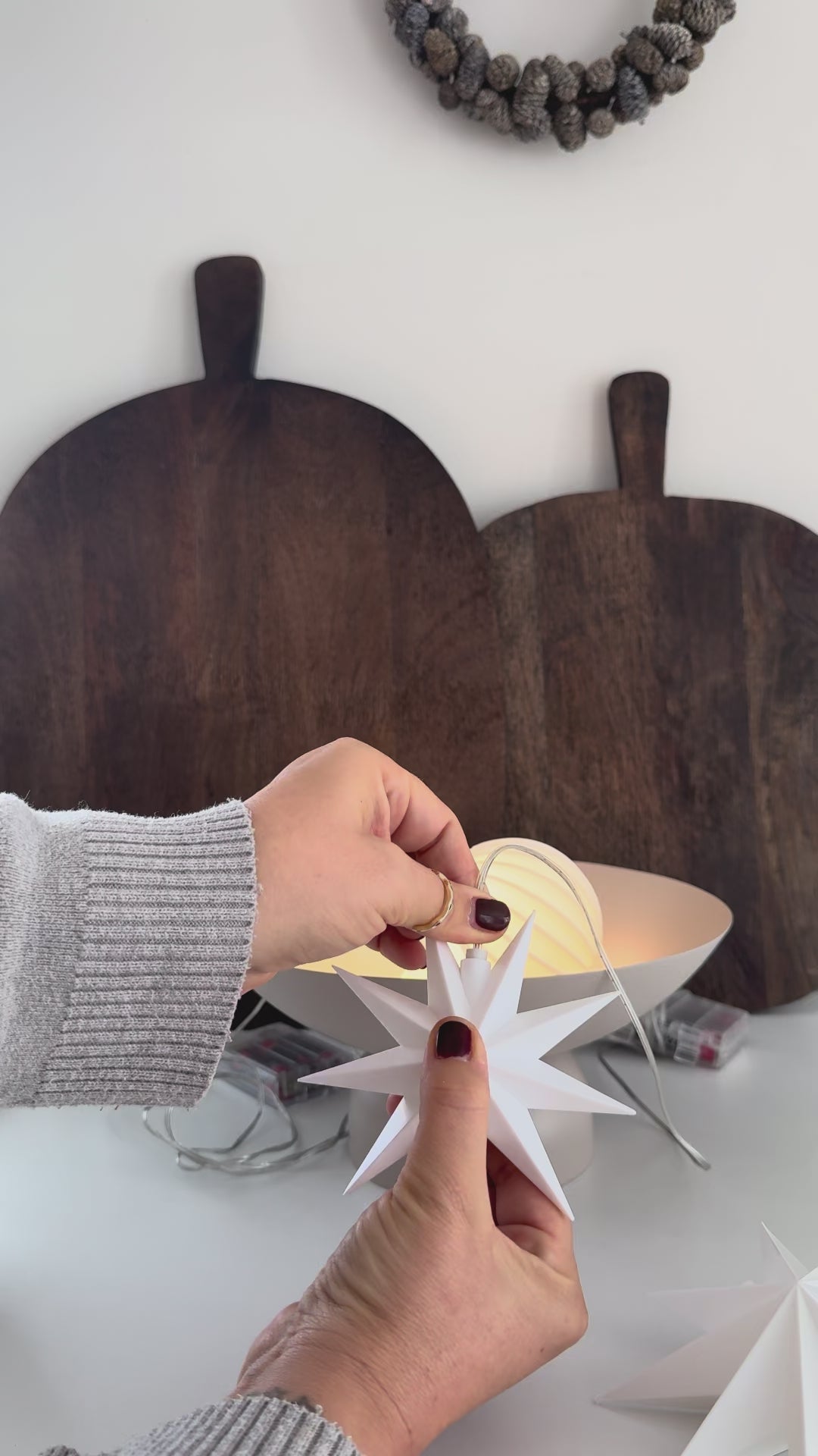 Beide Lampenschirmgrößen passen auf alle Sterne. Ganz gleich ob Einzelstern oder Lichterkette. Du kannst Größe & Design ganz frei wählen.