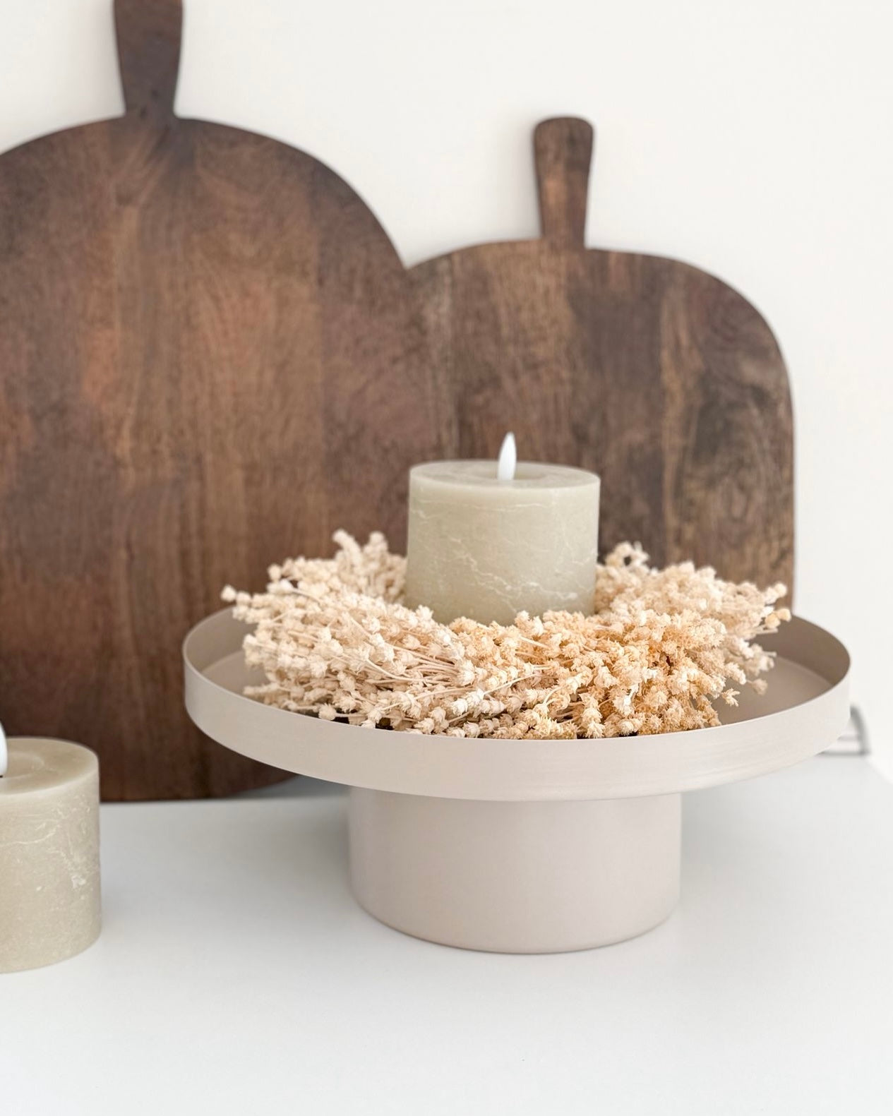 Dieses elegante Tablett mit Fuß vereint stilvolles Design und praktische Funktionalität. Gefertigt aus Metall und in wunderschönem Beige gehalten, setzt es dekorative Akzente auf jedem Tisch. Der erhöhte Fuß verleiht dem Tablett eine besondere Leichtigkeit und sorgt dafür, dass deine Arrangements – ob Kerzen, Blumen oder kleine Accessoires – perfekt in Szene gesetzt werden. Ob drinnen oder draußen, dieses Tablett wird zum stilvollen Mittelpunkt jeder Dekoration.
