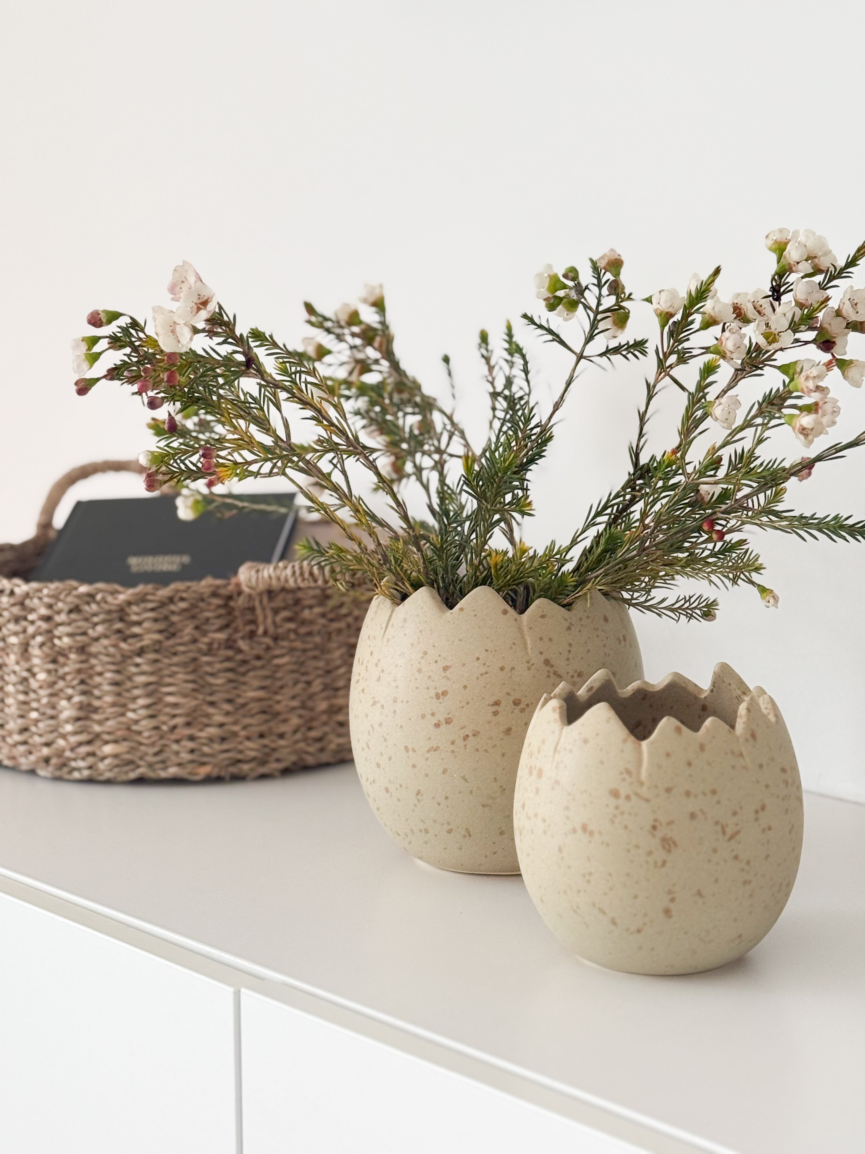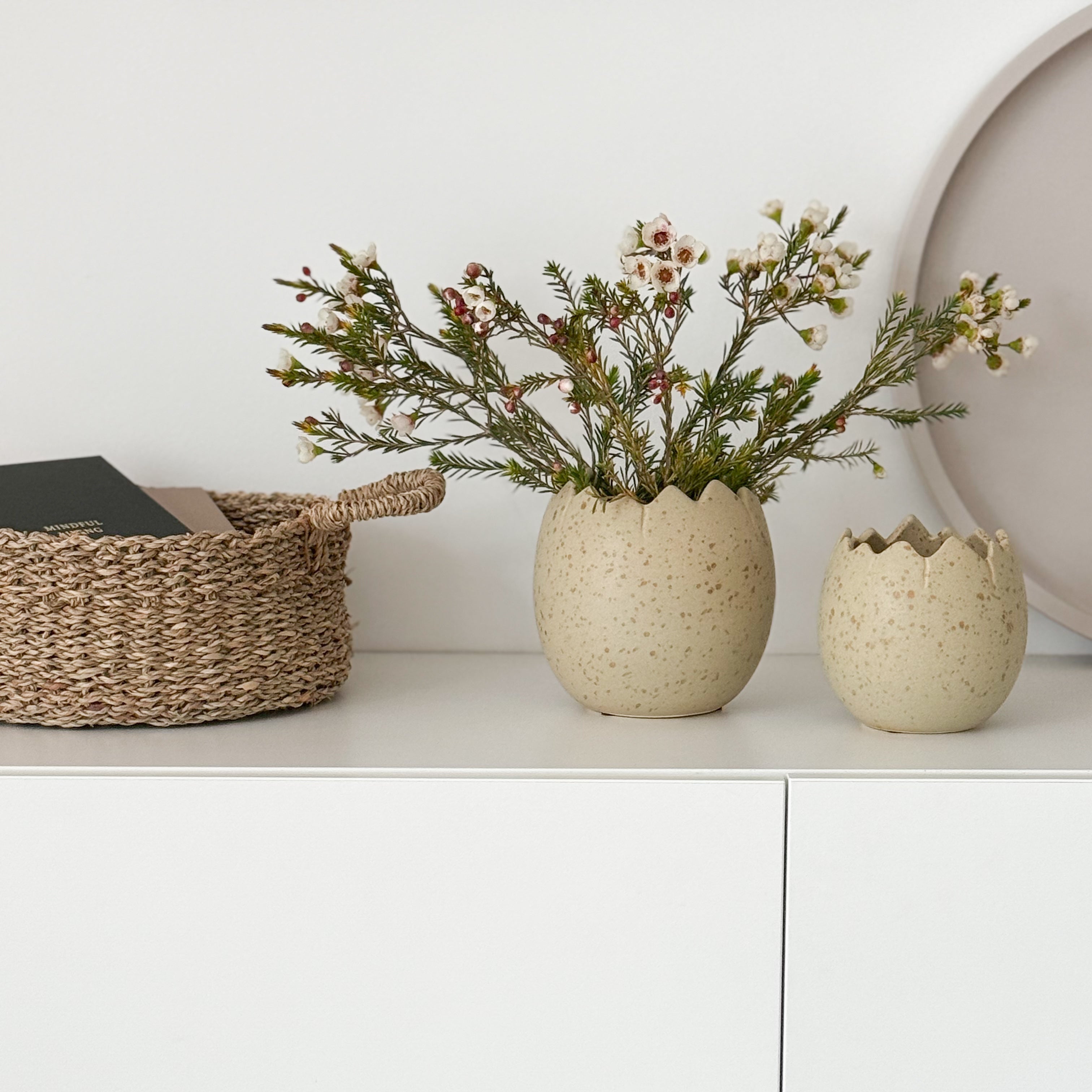 Die Ostereier sind handgemacht in Portugal und perfekt für Frühlingsblüher und Narzissen. Du kannst ebenso Bonbons oder andere Ostersüßigkeiten reinlegen. Stelle das Osterei auf dein Tablett. Es ist eine schöne Osterdekoration ohne kitschig zu wirken.
