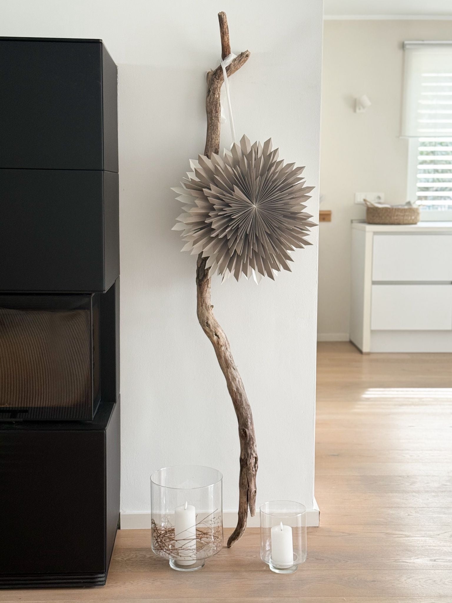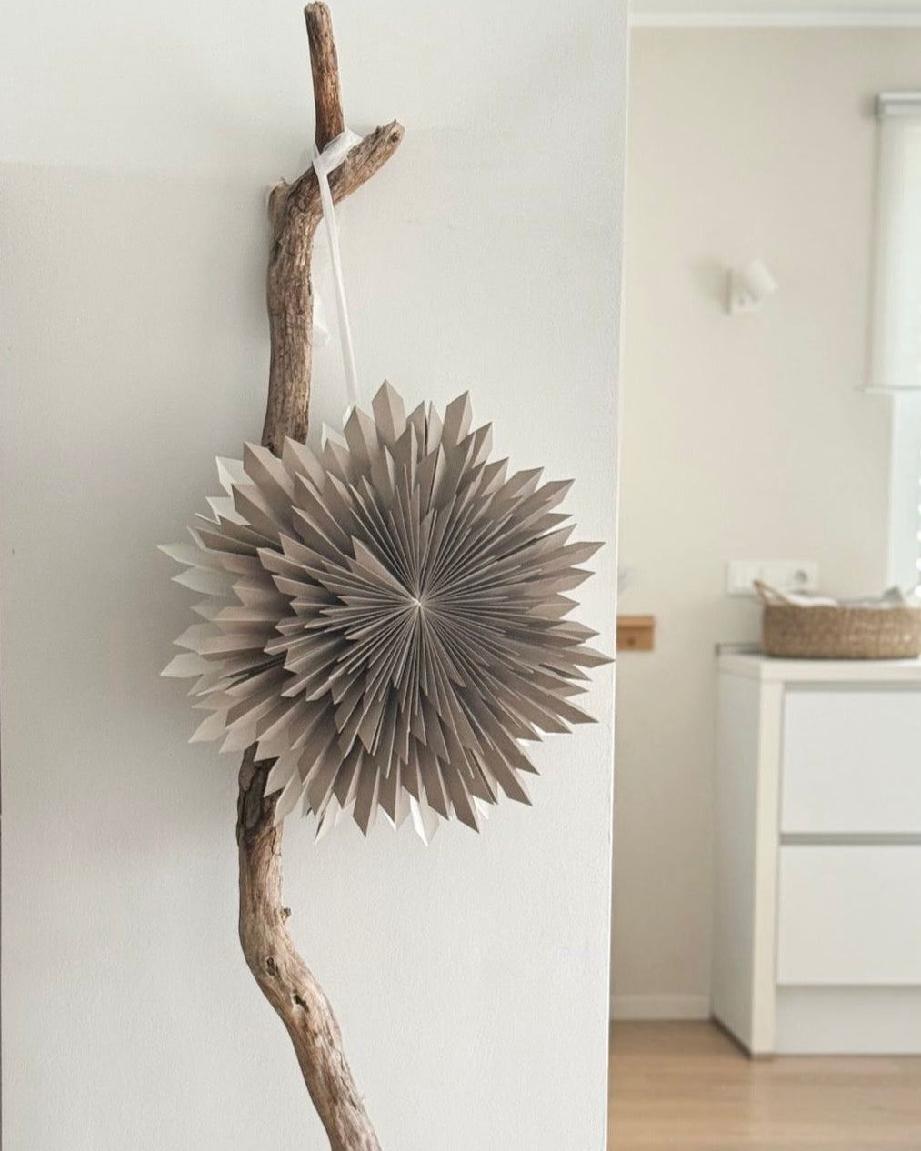 Der Stern besteht aus hochwertigem, festem Papier in einem sanften beige-grau und entfaltet durch seine kunstvoll gefaltete Struktur eine eindrucksvolle Wirkung – egal ob am Fenster, an der Wand oder frei hängend im Raum. Mit seiner Größe eignet er sich besonders gut als zentrales Dekoelement und verleiht jedem Raum ein festliches Ambiente im modernen, skandinavisch inspirierten Stil.