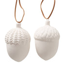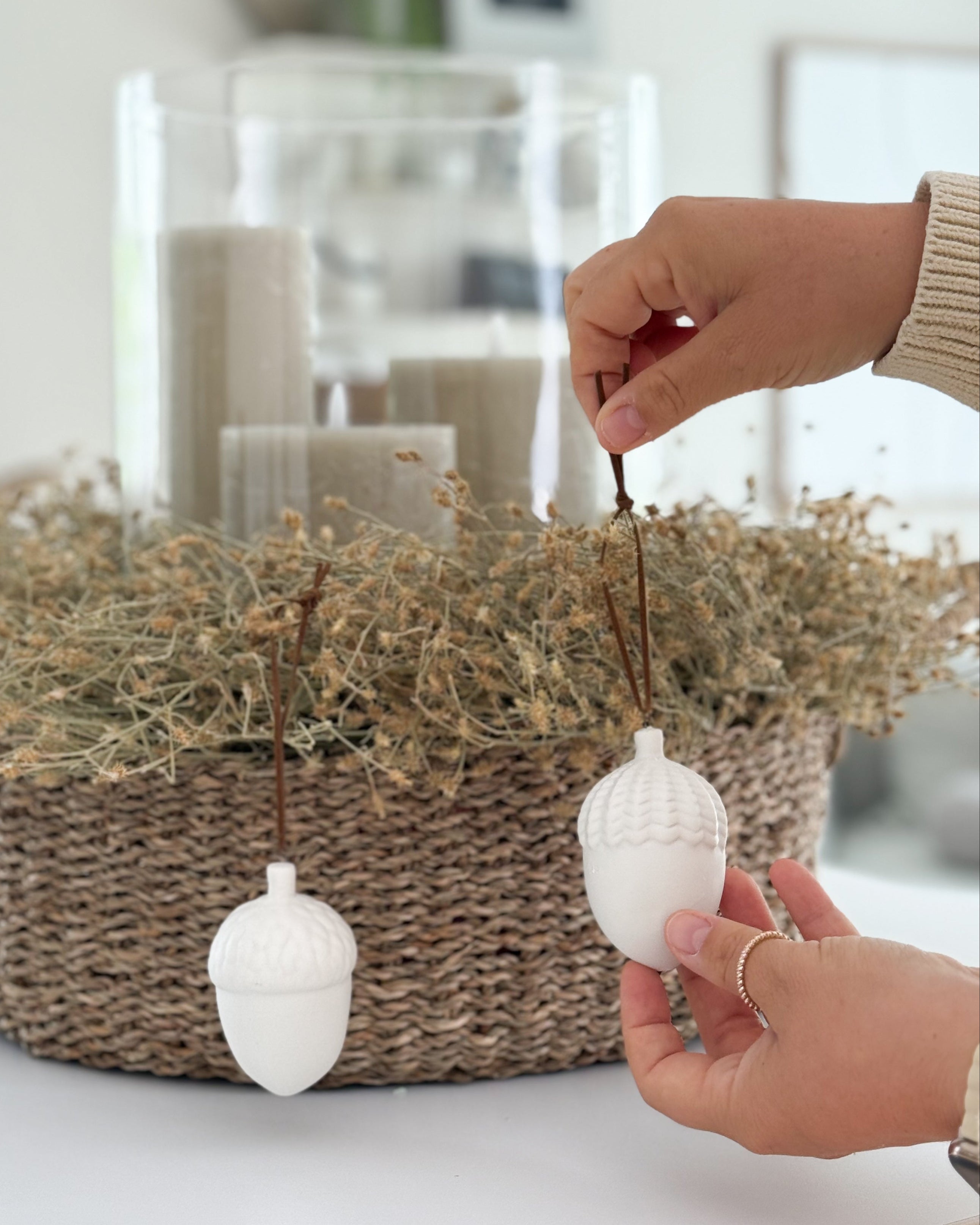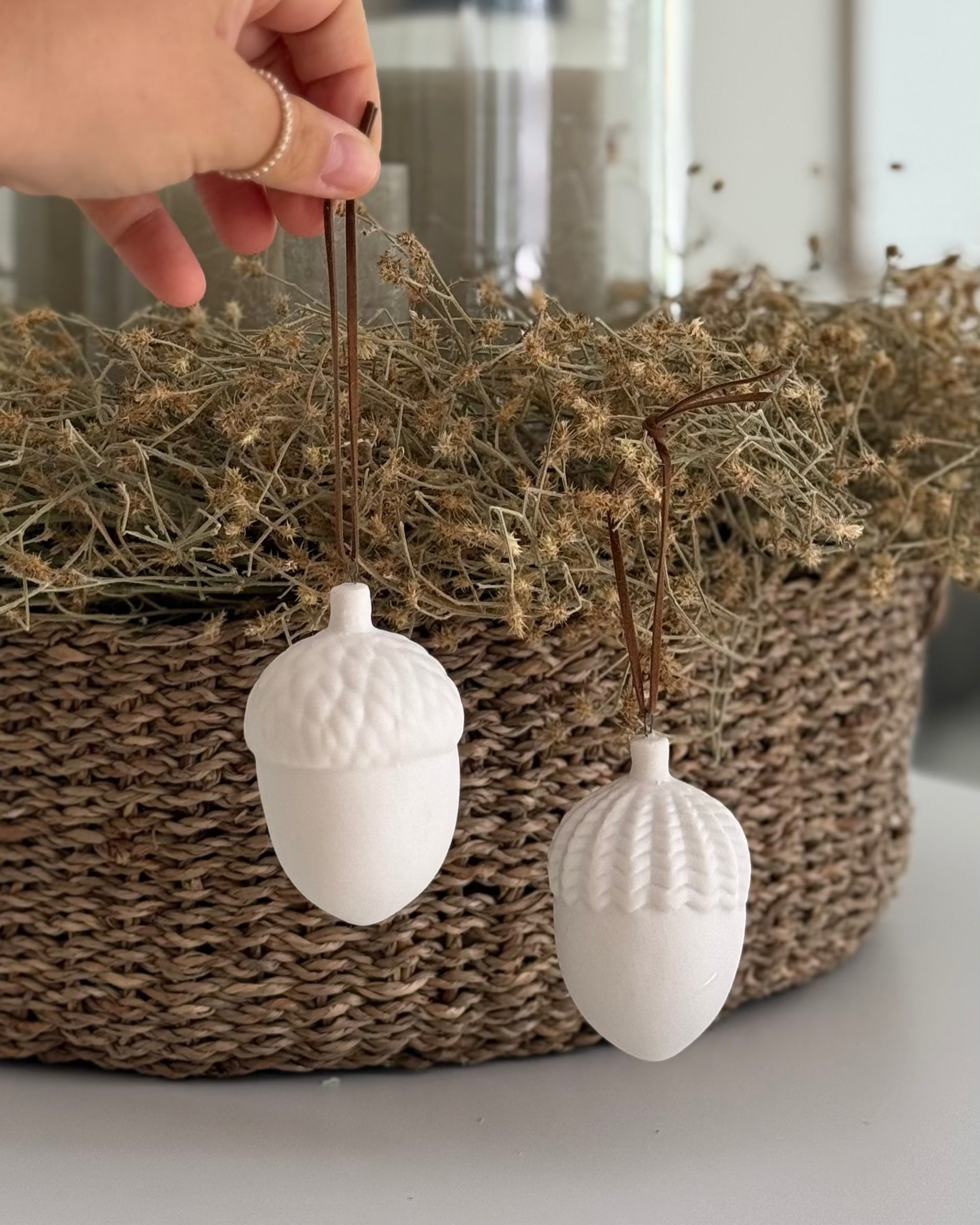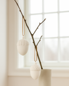 Mit dem Eichel-Duo aus feinem, mattweißem Porzellan bringst du ein Stück Waldzauber in dein Zuhause. Die detailreich gearbeiteten Anhänger mit kunstvoll strukturierten Kappen und weichem, samtigem Band vereinen Natürlichkeit mit edlem Design. Ob an einem Zweig, als Fenster- oder Tischdeko oder als Highlight am Weihnachtsbaum – diese Porzellan-Eicheln setzen stilvolle Akzente in jeder Jahreszeit.