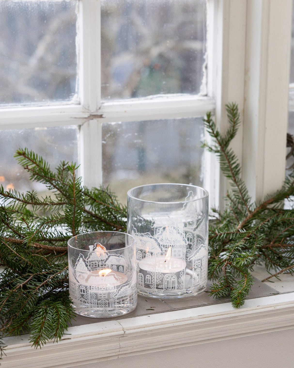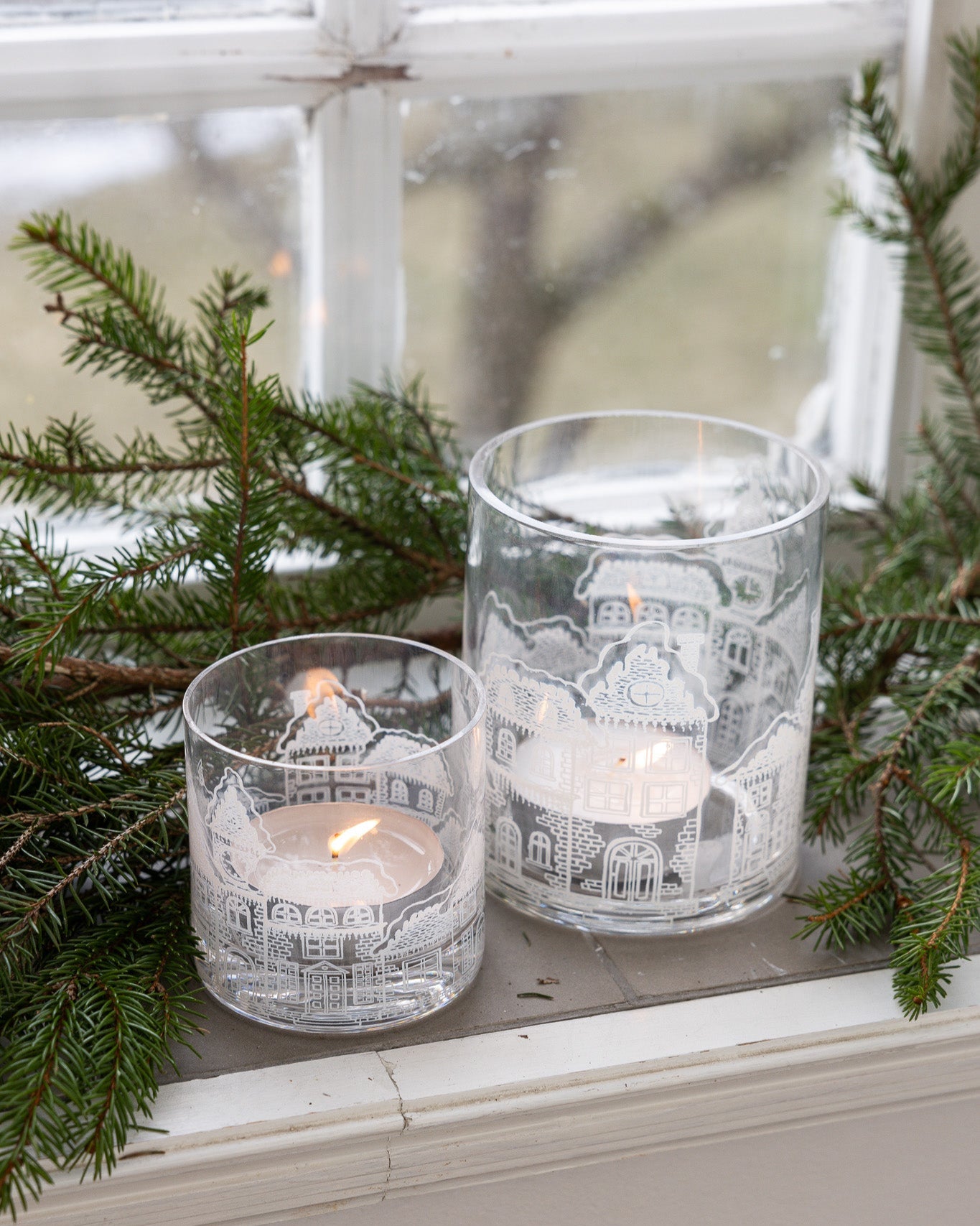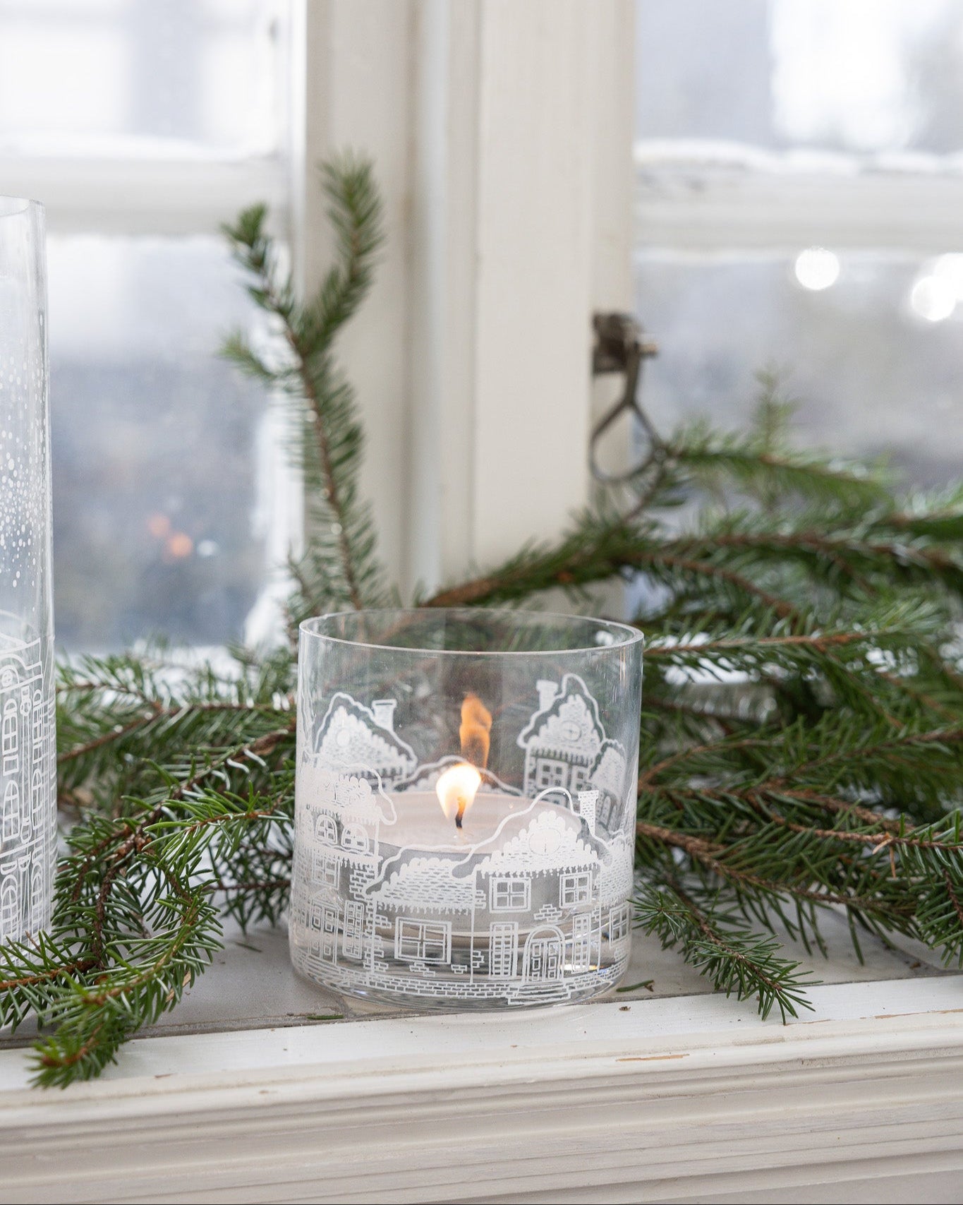 Verwandle dein Zuhause in eine leuchtende Winterlandschaft mit dem Windlicht-Set „Byhult“. Die zwei stilvollen Teelichthalter aus klarem Glas sind liebevoll mit detailreichen Illustrationen eines verschneiten Dorfes verziert. Sobald das Teelicht brennt, erwachen Fenster und Dächer zum Leben – für eine besonders gemütliche Atmosphäre in der dunklen Jahreszeit.