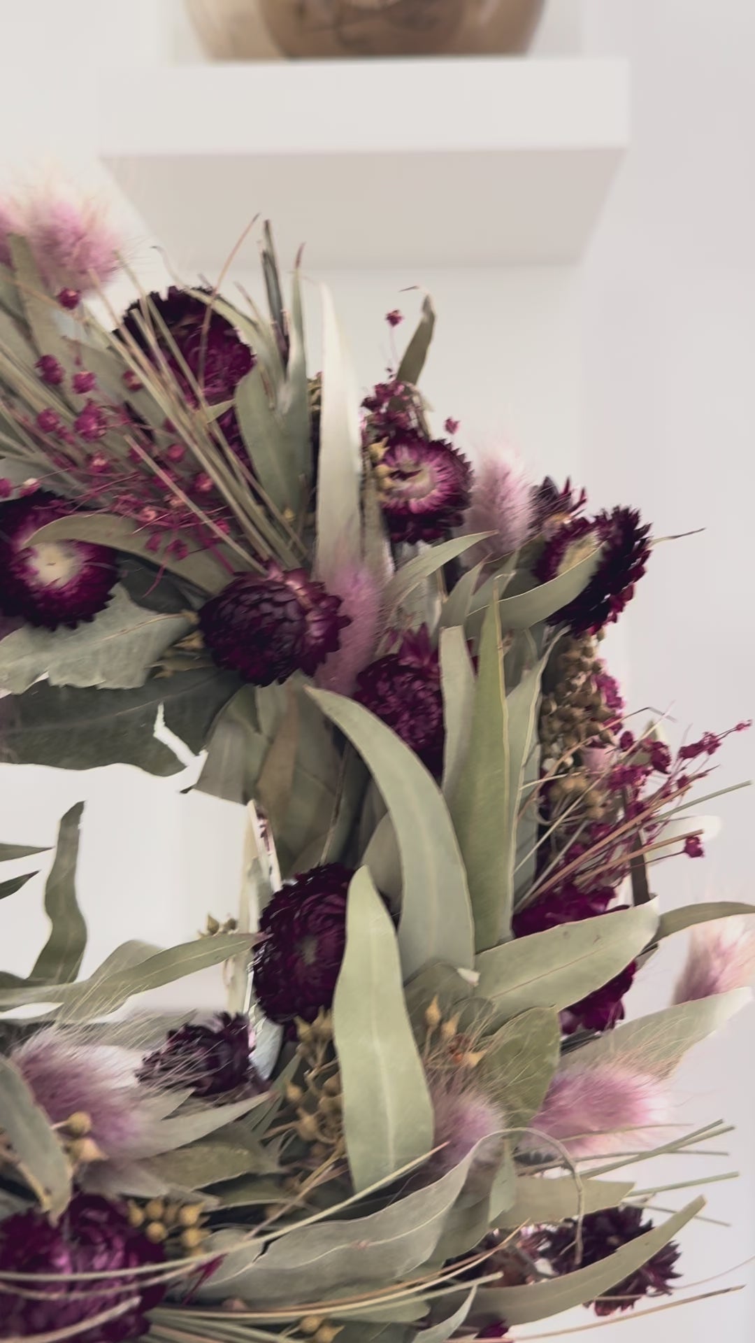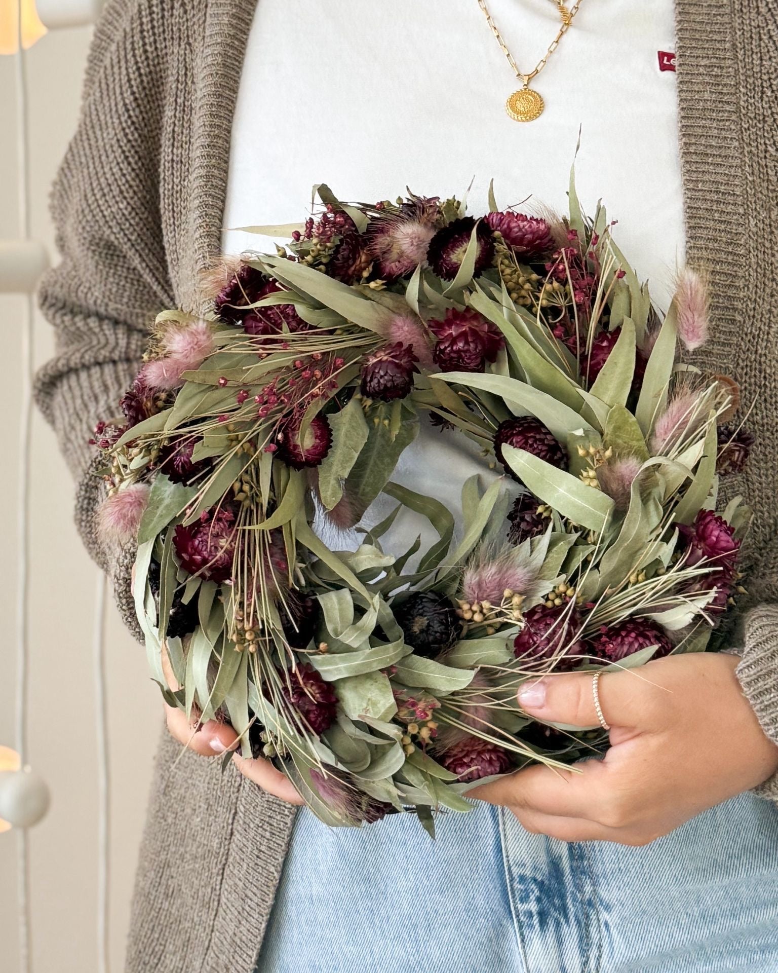 Dieser handgefertigte Trockenblumenkranz vereint eine harmonische Mischung aus zarten Blättern und farbintensiven Blüten in Rosé-, Pink- und tiefen Bordeaux-Tönen. Die Kombination aus Eukalyptusblättern, filigranen Gräsern und sorgfältig ausgewählten Trockenblumen schafft ein einzigartiges, zeitloses Arrangement, das jedem Raum eine warme, natürliche Atmosphäre verleiht.